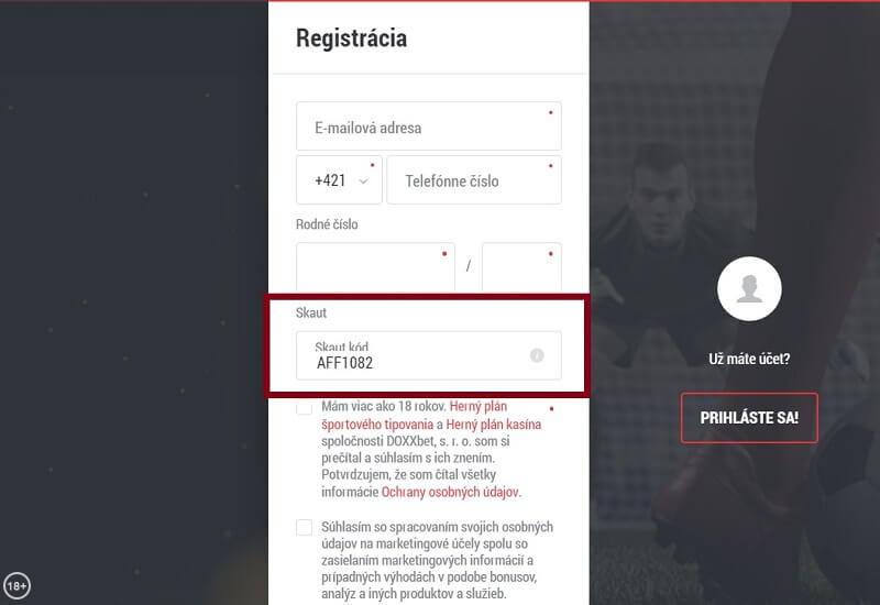 Registračný bonus online casina Doxxbet má dve úrovne – 50 voľných zatočení máte garantovaných, ďalších 25 voľných zatočení obdržíte, ak počas registrácie uplatníte náš Skaut kód AFF1082. Skaut kód je potrebné zadať v prvom registračnom formulári, do príslušného poľa (viď obrázok nižšie). Jedná sa o extra benefit bez skrytých podmienok alebo budúcich obmedzení.