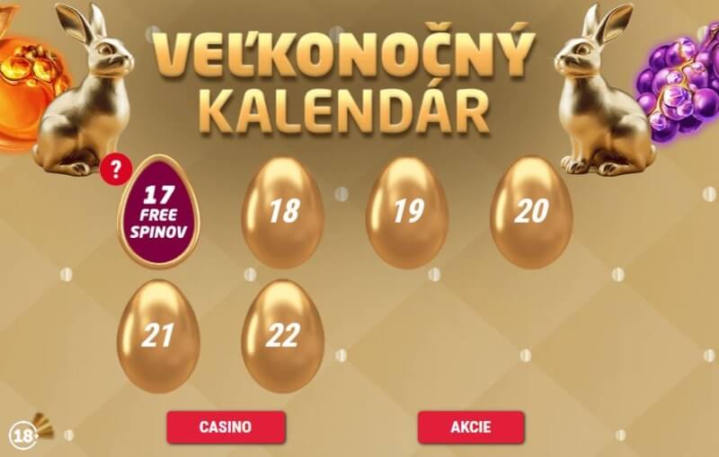 Okrem možnosti zapojiť sa do Veľkonočného turnaja si môžete od štvrtka 17. apríla až do utorka 22. apríla pustiť do otvárania vajíčok s bonusmi vo Veľkonočnom kalendári. Postup je veľmi jednoduchý, pretože sa stačí vždy len prihlásiť do hráčskeho účtu a následne si otvoriť Veľkonočný kalendár.